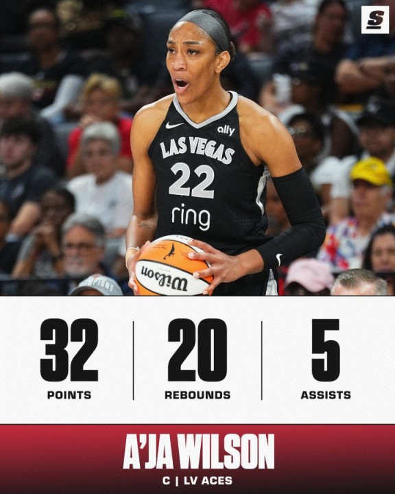 阿贾-威尔逊出战36分钟,投篮25中13,三分1中0,罚球6中6,爆砍32分20篮板(7前场)5助攻2抢断,正负值+17!