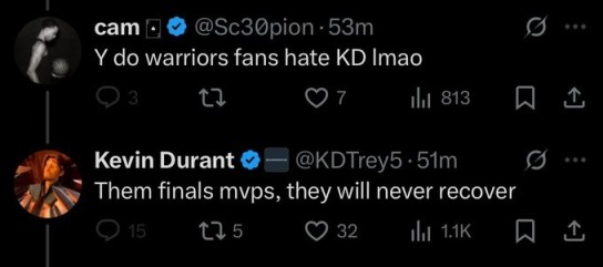 杜兰特:“这触动了你的神经。我理解。就像我说的,我们对自己投入心血的事业都非常敏感。你把Warriors Muse建立起来,结果另一个Muse账号一说他们更好,你就准备开战了,哈哈哈。”