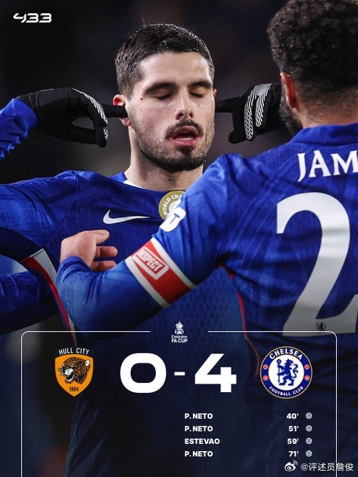“切尔西少帅罗塞尼尔带领切尔西4:0淘汰老东家赫尔城,内托独中三元埃斯特旺锦上添花小德拉普助攻‘帽子戏法’。”